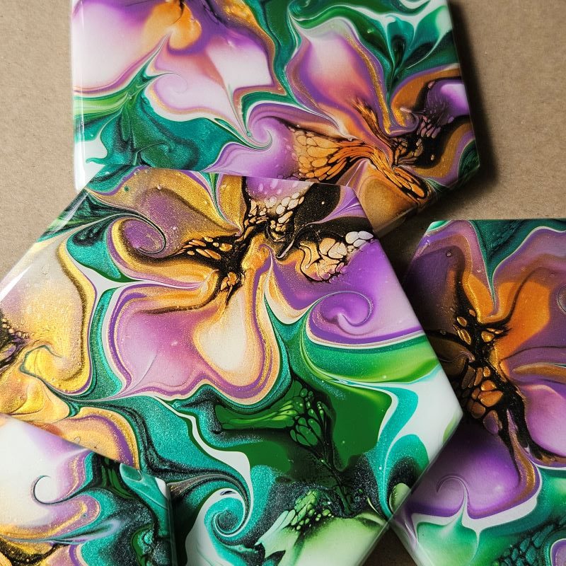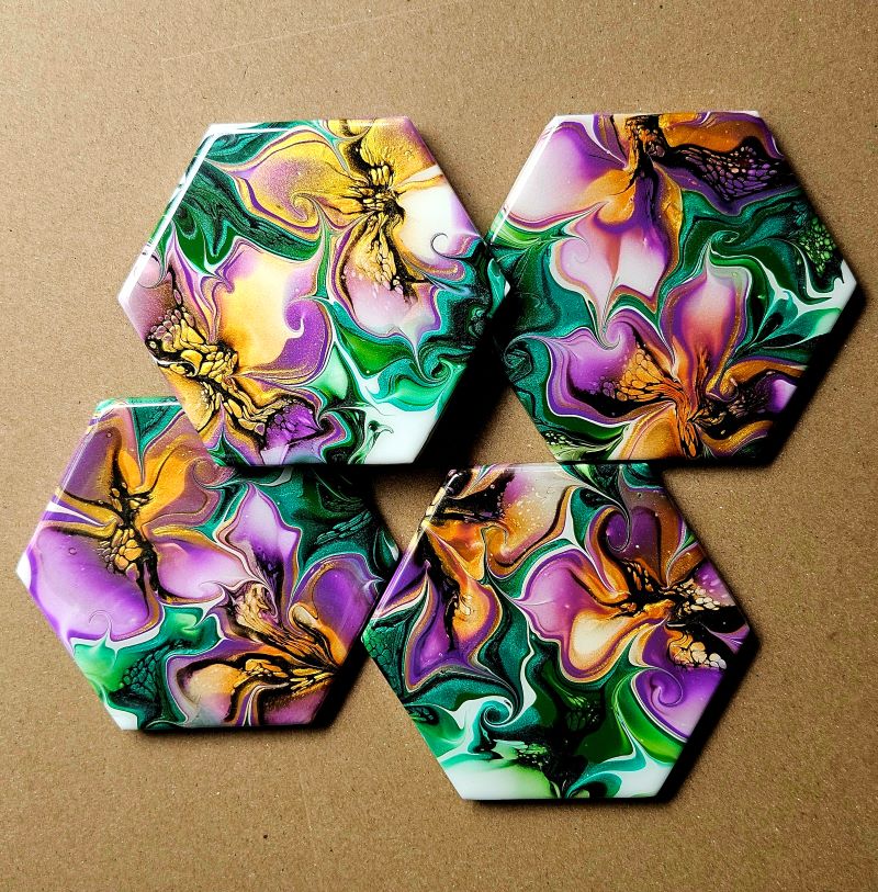 This set includes four coasters, each showcasing handmade acrylic bloom-style fluid art on hexagonal ceramic tiles. Every coaster is individually sealed with a durable resin coating and has a cork backing for added longevity.