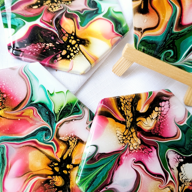 This set includes four coasters, each showcasing handmade acrylic bloom-style fluid art on hexagonal ceramic tiles. Every coaster is individually sealed with a durable resin coating and has a cork backing for added longevity.
